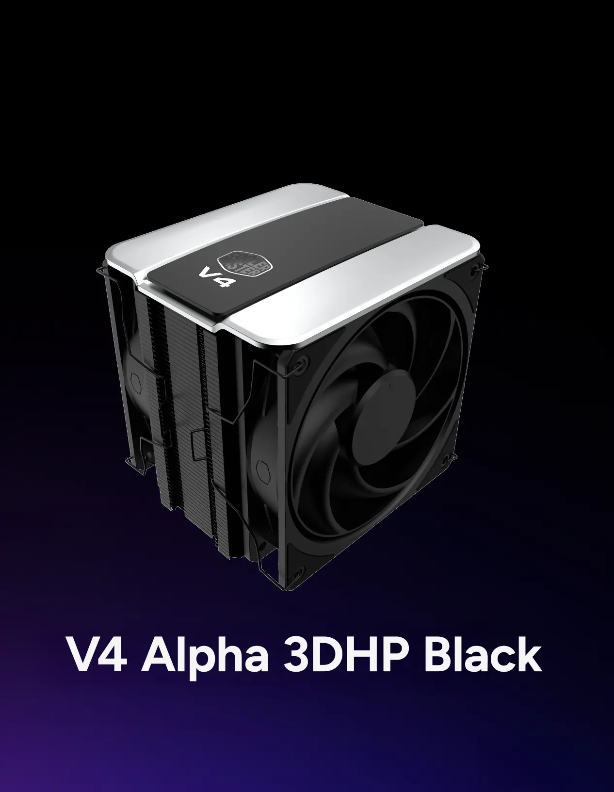 Cooler Master describes the V4 Alpha as inspired by classic V-style engine aesthetics and the cooler uses the same 3DHP heat pipe array as the Hyper 212 models.